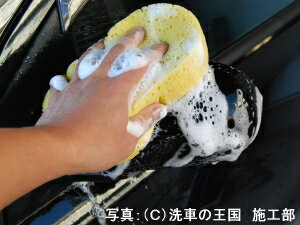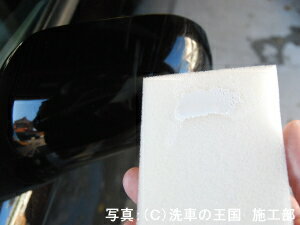 研磨の際は塗って拭くだけでは、キズを落とすことはできないので、縦横にゴシゴシと研磨します(p`・Д・´q) 最後に、濃色のお車は『ユーティリティースポンジ』で研磨すると、よりきれいに仕上げることができます! → いかがでしょう!? スッキリきれいになり、まるで鏡のようですね♪
